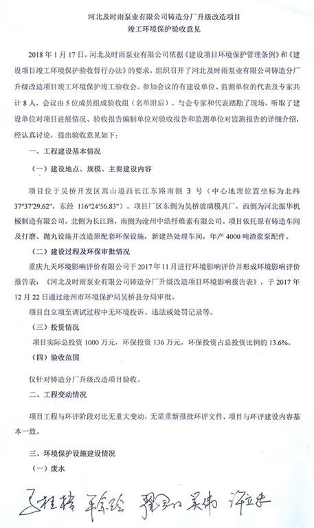 河北及時雨泵業(yè)有限公司鑄造分廠升級改造項(xiàng)目竣工環(huán)境保護(hù)驗(yàn)收意見公示-河北及時雨泵業(yè)有限公司